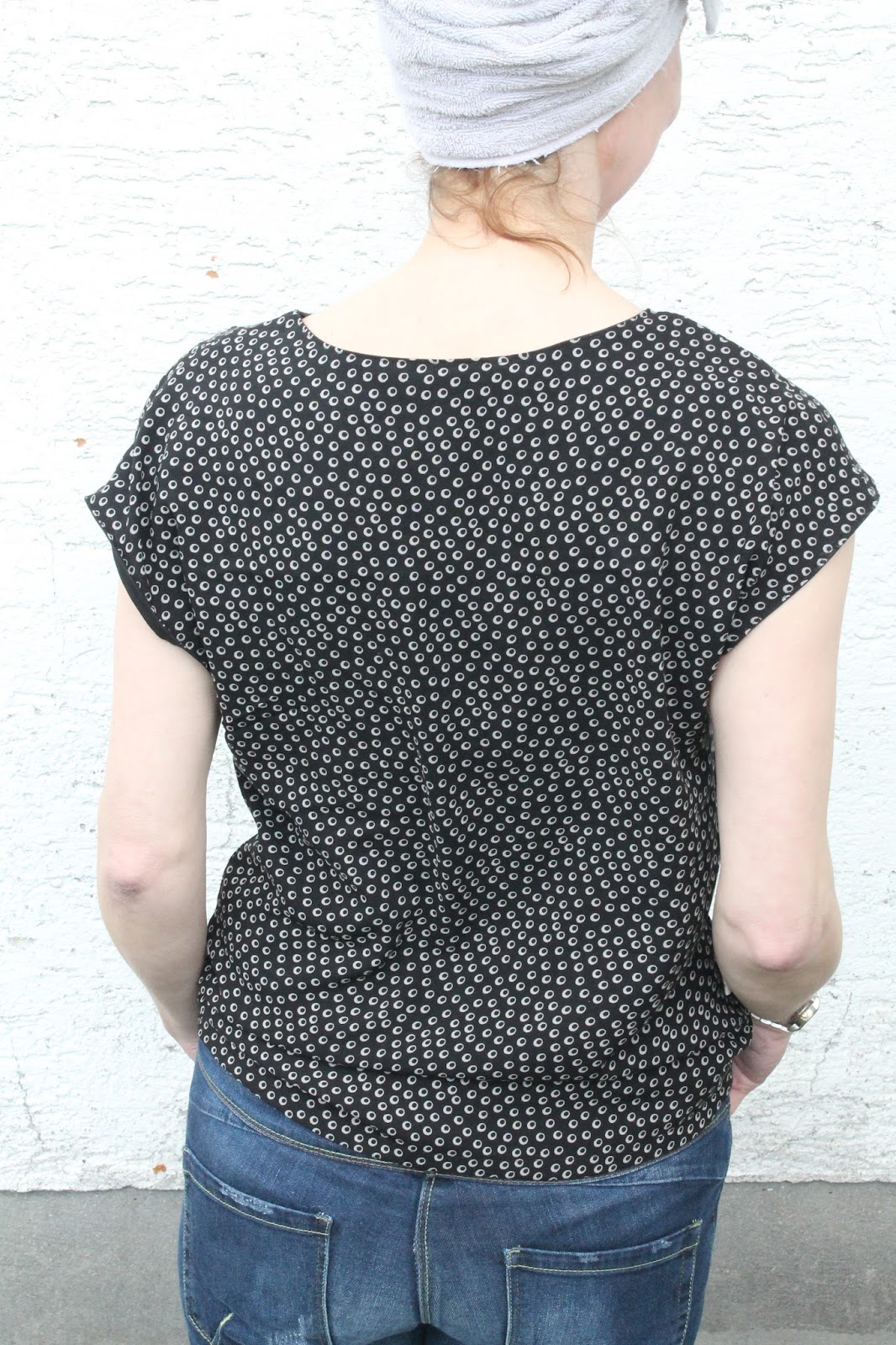 Genäht habe ich sie aus Viskose aus meinem Vorrat (denn neue will ich mir ja nicht mehr kaufen!). Im Prinzip war sie sehr einfach zu nähen, wenn, ja wenn ich mir alle Markierungen dierekt auf den Papierschnitt übertragen hätte. Denn ohne Faltenknipse wusste ich nicht wie das funktionieren sollte. Also nochmals genau geschaut, und da fanden sich auch die richtigen Markierungen. Danach ging alles flott, Arm- und Halsausschnitt sind mit Schrägband versäubert.