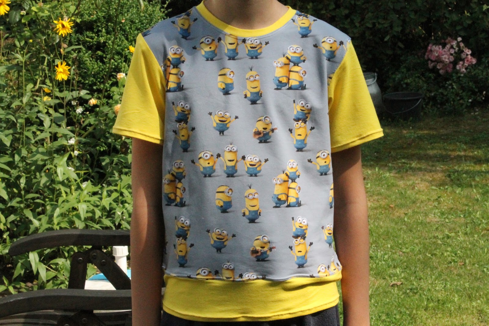 Als ich dann Montag morgen das Schnittmuster hervorholte, Ottobre kids 2/2003, musste ich entsetzt feststellen dass ich zu wenig Stoff habe, schrei. Da kam mir die Idee mit dem farbigen Bündchen. Der Minionsstoff ließ sich aber sehr schlecht verarbeiten, er rollte sich immer auf. Es war irgendwie ein „Montagsstoff“. Ich saß bestimmt über 2 Stunden an diesem simplen Shirt, naja, Ende gut, alles gut!